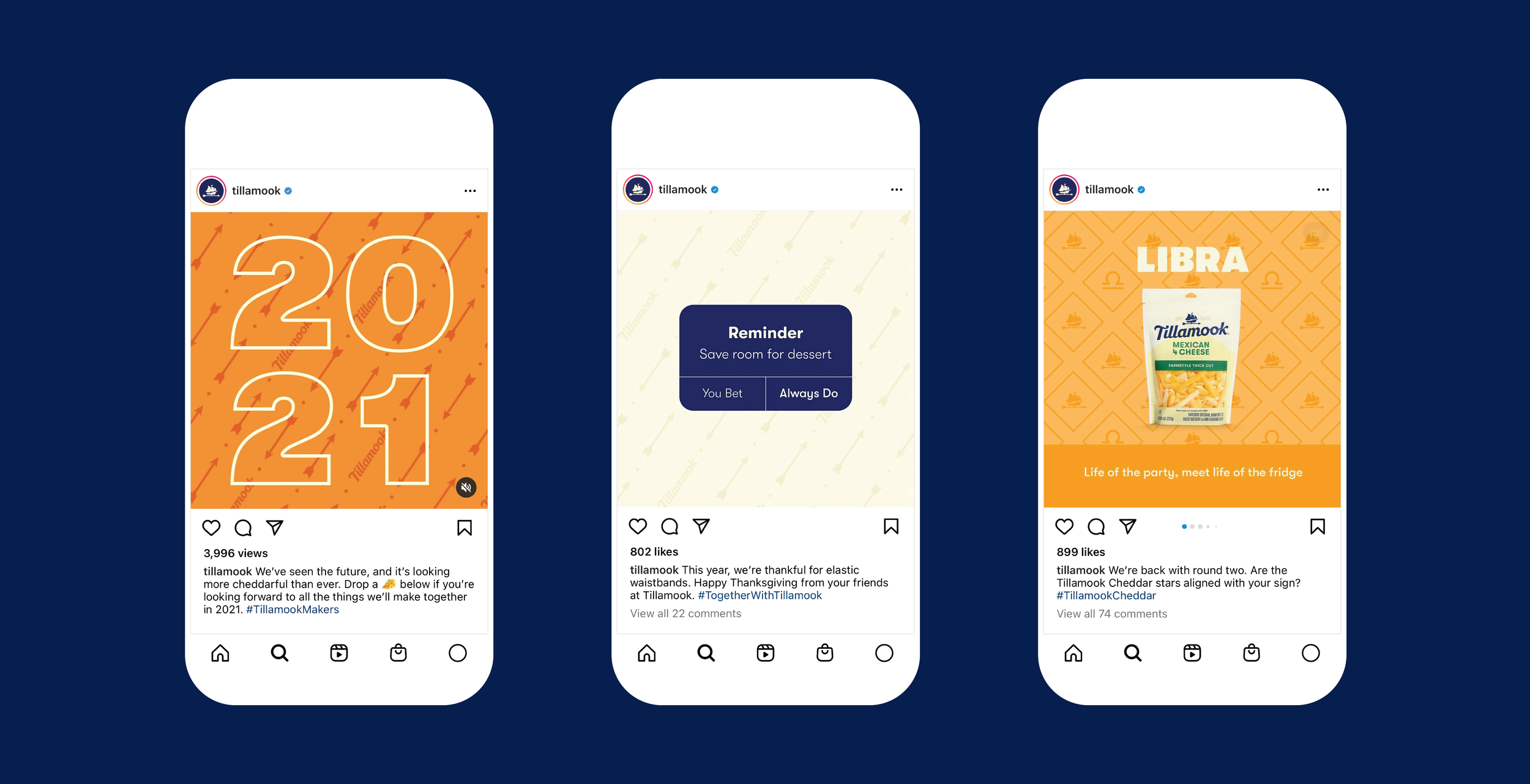 Original pattern and design elements for Tillamook's 2021 Holiday campaign. Shown below is the design as well as how it showed up across Tillamook’s digital platforms.